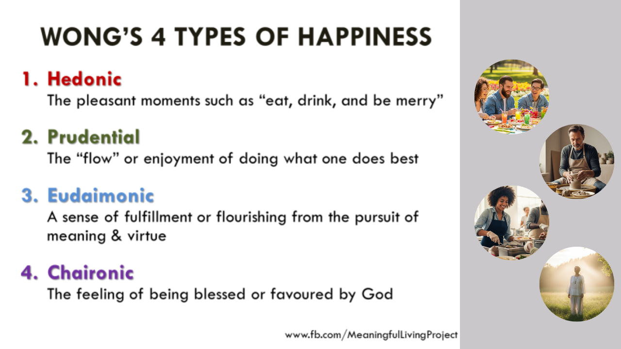 Our late Dr. Paul Wong, a wonderful teacher and psychologist, shared a profound insight with us: he said, ‘Happiness comes in distinct forms, each touching a different part of who we are."